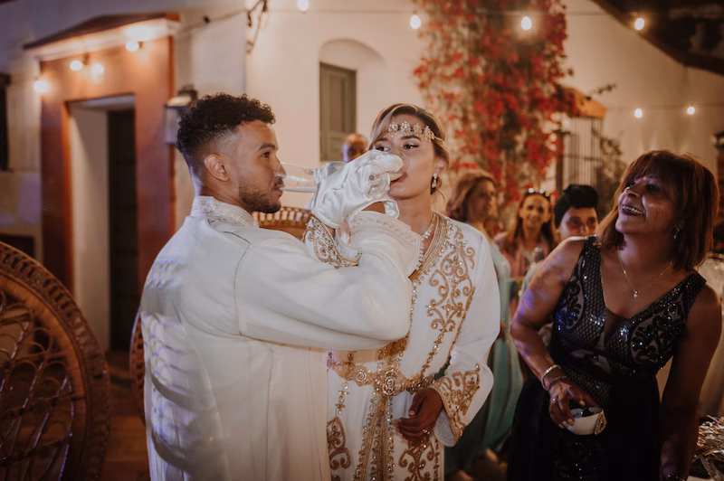 Como venue escogieron una lujosa venue, hotel Hacienda de Orán, como recuerdo al origen de la familia de Hocine. Y los invitados pudieron disfrutar de la sorpresa de flamenco en directo durante los aperitivos y dos ceremonias: una civil llena de flores y preciosa decoración de La Buganvilla Arte Floral y la Ceremonia de la Henna tan característica en las bodas árabes. Así como la entrega de la suegra de Thelma a ella de una bandeja con miel, henna y leche para darle la bienvenida a la familia y la miel y la leche que hace referencia a la abundancia, la suavidad y la fertilidad y que se llama Buya.